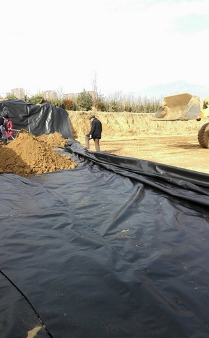 在防滲膜的施工中,采用兩布一膜的方法。在實際施工前,應(yīng)加強防滲膜和土工布材料的質(zhì)量檢驗,確保產(chǎn)品各項技術(shù)指標達到標準要求和設(shè)計要求。防滲膜和土工織物應(yīng)具有一定的抗頂穿能力,以避免土方開挖過程中膜下卵石和根系頂穿。