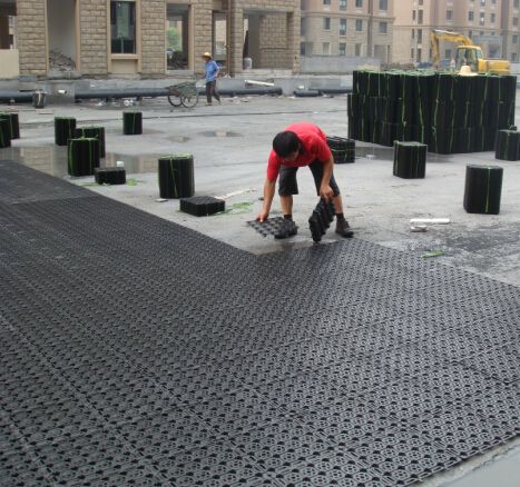 蓄排水板鋪設(shè)完畢后,可進行下一道工序,盡快鋪設(shè)好過濾土工布和基質(zhì)層,防止泥土、水泥、黃砂堵塞孔道或進入蓄排水板的蓄水、水槽、排水通道。為確保蓄排水板充分發(fā)揮其作用同時可在過濾土工布上面鋪上操作板,方便進行綠化施工。