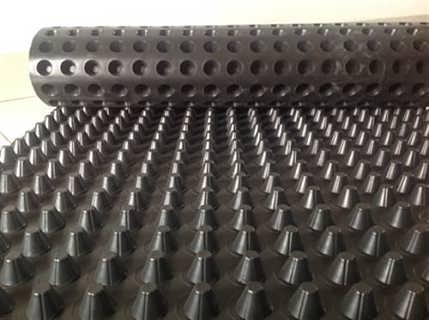 特殊工藝壓型在土工膜上壓出封閉突起的圓臺狀、柱狀、球冠狀殼體,形成的一種膜、殼連續(xù),具有立體空間和一定支撐剛度。結(jié)合表面鋪貼的無紡?fù)凉げ紴V水層。構(gòu)架出架空層,利用架空層形成排水、排氣通道,同樣利用架空層達到隔音、隔振的功能。在排水板上鋪貼的土工布濾水層阻止泥土微粒通過,避免通道阻塞,使孔道排水順暢,從而形成一個具有滲水、貯水和排水功能的系統(tǒng)。